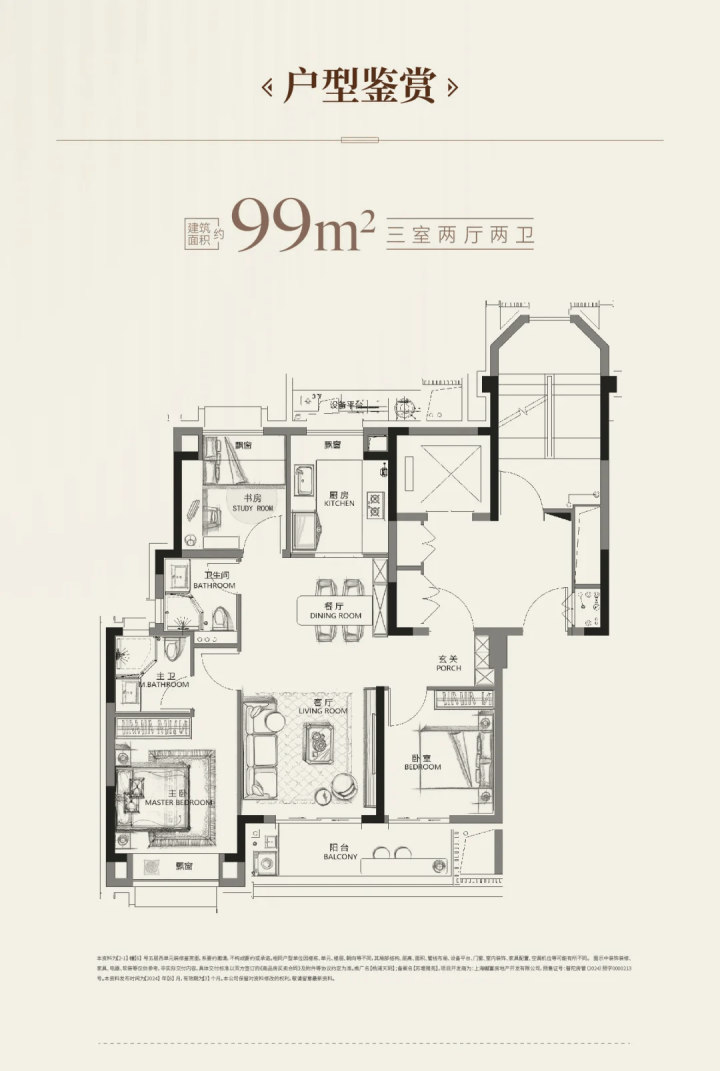 建面约99平米3-2-2飞机三开间朝南户型,动静分区,南北通透,南向面宽约9.5m,采光和通风条件十分优越!