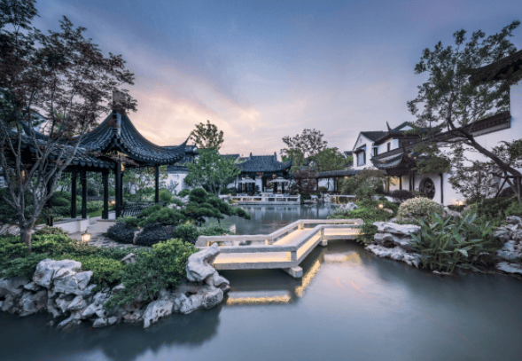 中式园林,是最纯粹最理想的精神皈依之所!进入园林庭院,古朴有致,瘦漏透皱的太湖石下一方清泉涵韵其间,低头有池水如镜,抬头有瀑布如练,“水积必然龙有穴”,富贵因子已然埋藏于此!
