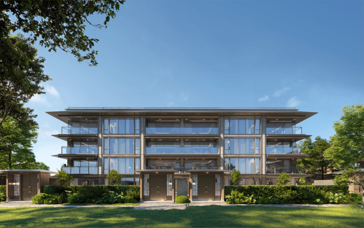项目立面以多种新中式元素构筑东方建筑美学,横向采用大面玻璃幕墙,保障隐私的同时,尽可能的增大建筑内外场景对话。