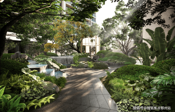 进入社区门庭,便可看到错落有致的生态置石上流淌着涓涓流水,抚平每一位归家业主的心绪,小区游园时,更能欣赏到一幅随四季流转的植物画卷。