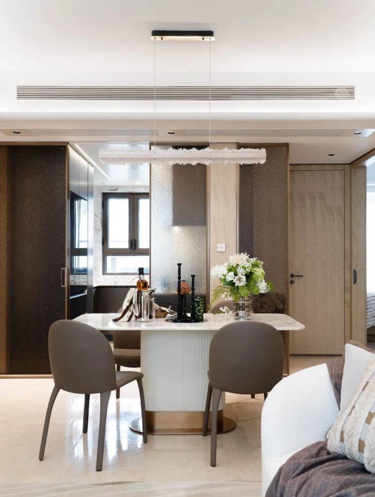 宽U型半开放厨房,全移门可开可闭,橱柜延伸到外侧餐边柜,可以正对岛台或者餐桌,形成更灵动的生活体验。