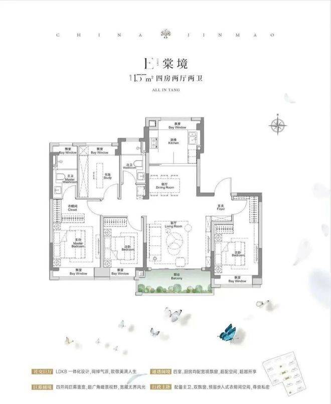 建面约117㎡3房2厅2卫,做到了3+1开间朝南+5个飘窗+主卧套房设计+270°转角飘窗,所有的尺度都有进一步提升。