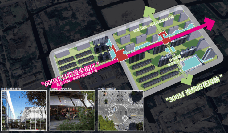 这些丰富的生活场景,则由两条景观轴线串联:一条是约300米的连续花园轴;一条是约600米的日常漫步街区。