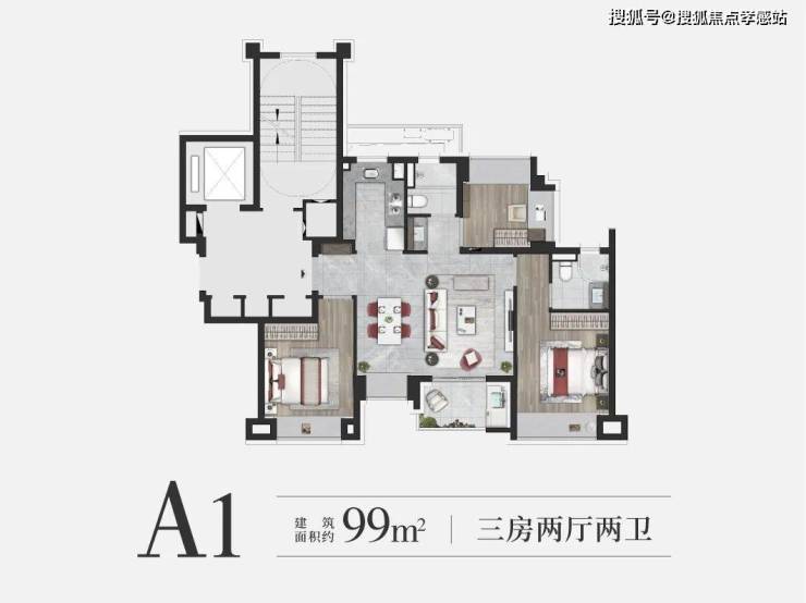 建面约99㎡3房(A1户型),做到了3.5开间朝南设计,整个户型几乎没有浪费面积~实现空间节约、居住升级等美好体验。