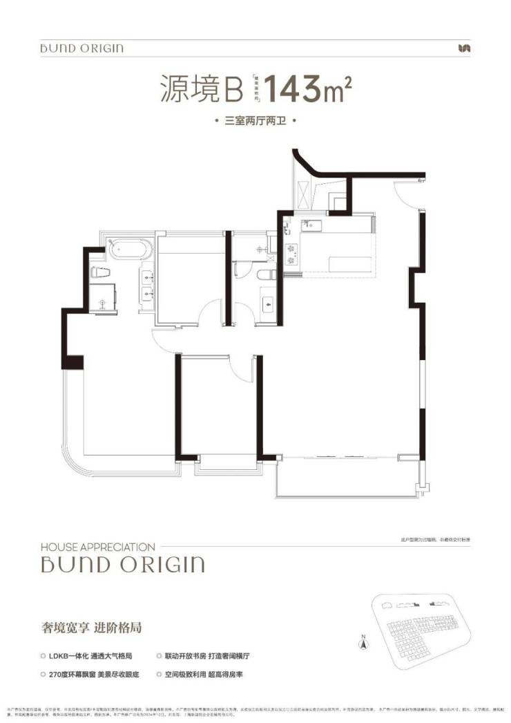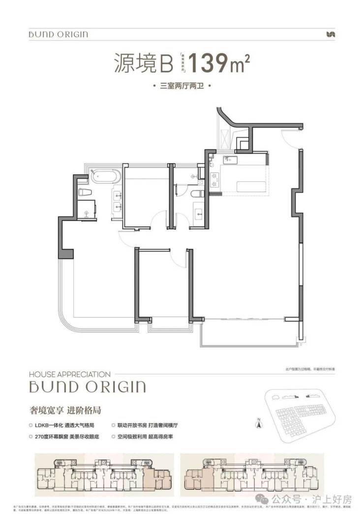 B户型是3房2厅2卫格局, 三开间朝南+LDKB一体化+奢阔宽厅+全卧室带飘窗+主卧套房设计+动静分离+主卧270度飘窗,舒适度更高。
