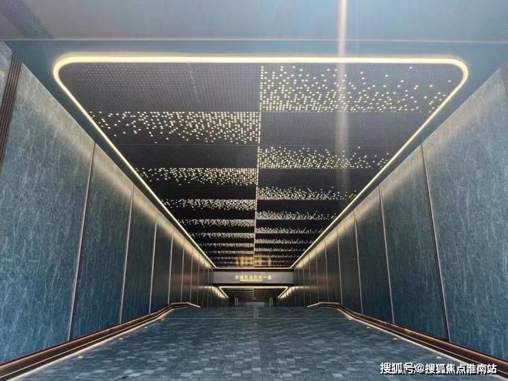 星空连廊的顶面采用香槟金铝板、墙面为爱马仕灰仿石砖,并镶嵌金属线条、就连地面都采用了夜里雪仿石砖。