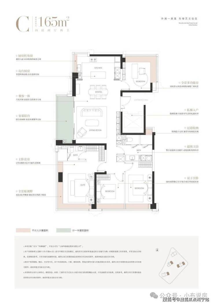 大横厅尺度感奢阔,尊享私梯入户,隐私性满分!三间卧室朝南设计的平权户型,老人、小孩均可享受南向采光;厨房转角窗、主卧套房、北向书房均配置270度转角飘窗,景观视野相当不错!次卫四分离设计,相当人性化~