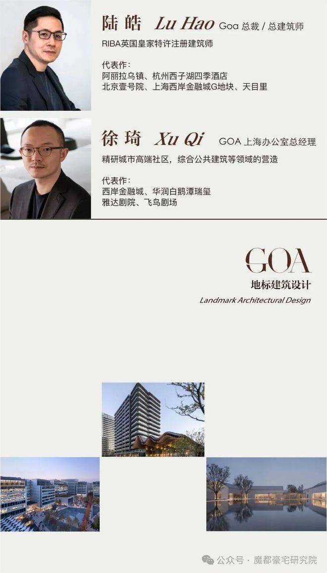 GOA大象设计担纲建筑设计;渡边智昭负责会所和架空层设计,他是2023 AD 100 中国最具影响力建筑和室内设计师,代表作翠湖天地、汤臣一品;TROP操刀艺文景观设计;室内由W.DESIGN无间设计、李益中精琢...