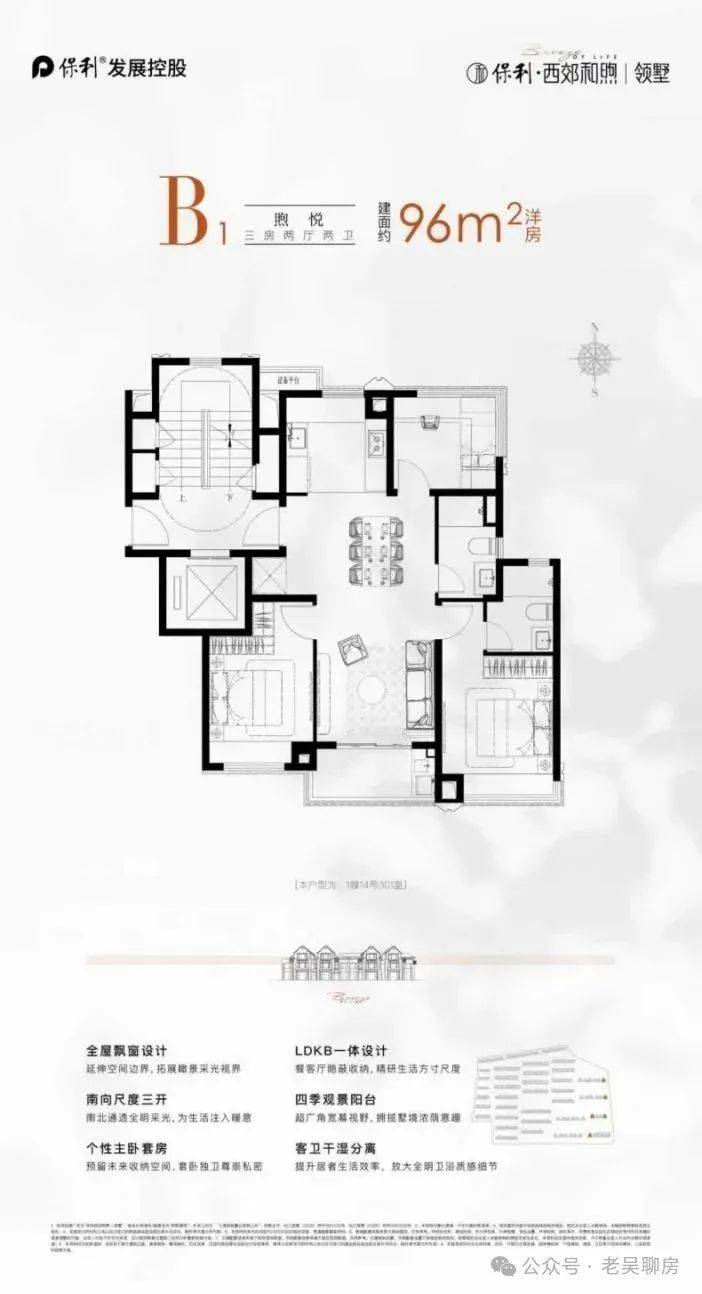 建面约 96㎡的 洋房户型,以三房两卫的全能格局。LDKB 一体化设计,打破空间边界,让餐客厅与阳台流畅相连,成为家庭互动、宴请宾客的活力场域 。全屋飘窗延展空间,引阳光与风景入室,三开间朝南、南北通透。北向多功能间,附带270°广角视界,让每一寸生活都浸润在风景里。主卧套房预留收纳空间,给予主人私密尊崇。从起居到观景,从社交到休憩,全方位适配品质生活需求,是洋房里的理想栖居范本 。