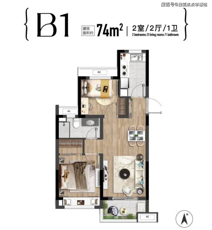这个建面约74㎡户型非常通透,基本上南北能开窗的部分都开了窗,所以采光和通风都很棒;