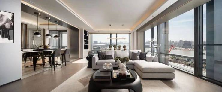 建面约240㎡边套,采用L型转角落地窗,打造了270°环幕瞰江视野,无论身处客厅、餐厅,都能以不同角度眺望黄浦江的波光粼粼