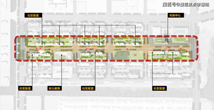 其中,一轴为生活街区轴,其聚合了文化活动室、生活服务中心、市民中心等丰富的公共空间,下楼可轻松享受到多元且丰富的邻里社交生活。