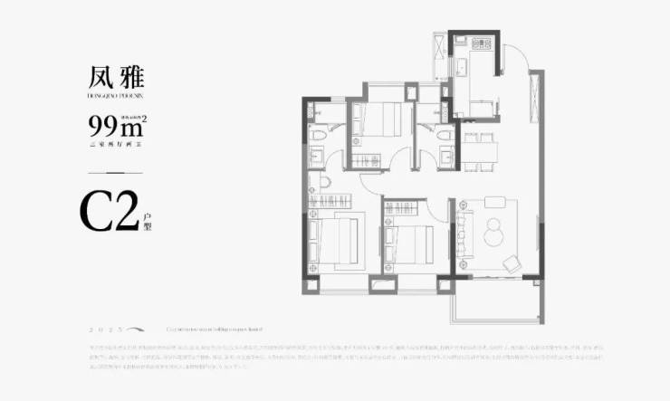 第三:主力约99㎡3房2卫,实用性很强,可以满足业主从二人世界到二胎生活的全生命周期需求。并且5飘窗+1阳台的设计,保证了室内充足的采光以及视野。