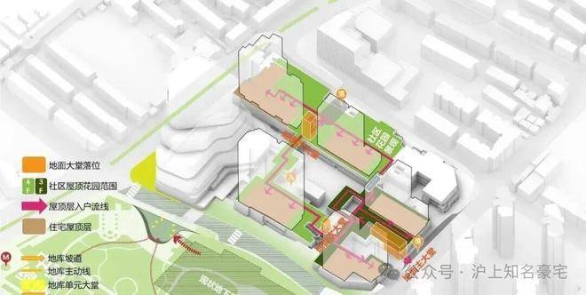 除了在动线设计采用了“不相交”的垂直体系外,项目还在商业与住宅之间嵌入一个独立的“X空间”!这里将住宅大堂、会所、架空层和高线公园巧妙连接,总规模近6100㎡,形成一个特殊的垂直绿化体系!