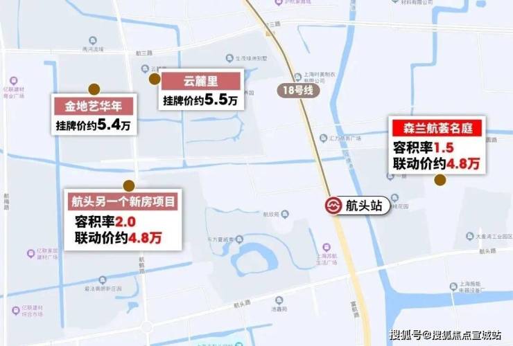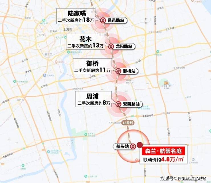 这直接奠定了18号线本身的价值。我们从项目所在的航头站一路往北看,更能发现项目和其它沿线板块,存在可观的价格差!