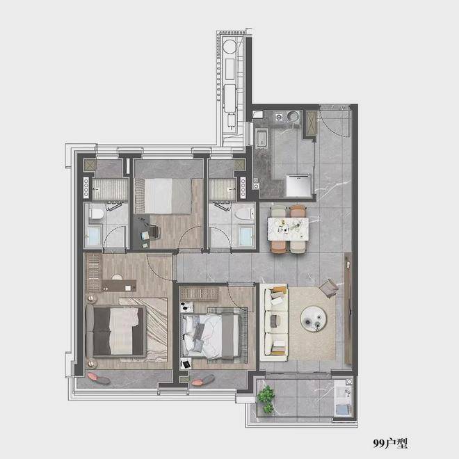 建面约99㎡的三房设计,在空间上使用功能更加多样化, 一站式解决了家庭生活的所有功能,优化居家动线,大大提升空间的居住体验。中环云悦府售楼处预约热线:400-8787-740