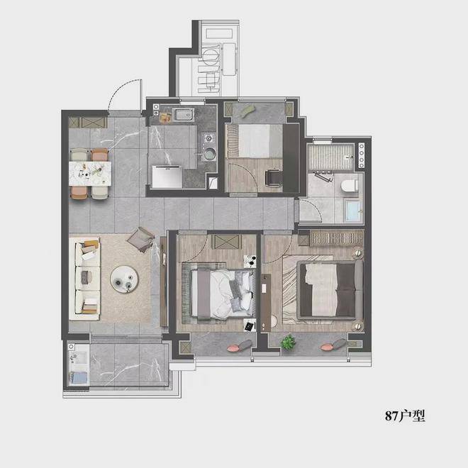 该户型贴合当代人居生活习惯,既适合三口之家小太阳家庭,也可以是三代同堂,每个人都能拥有独立空间。