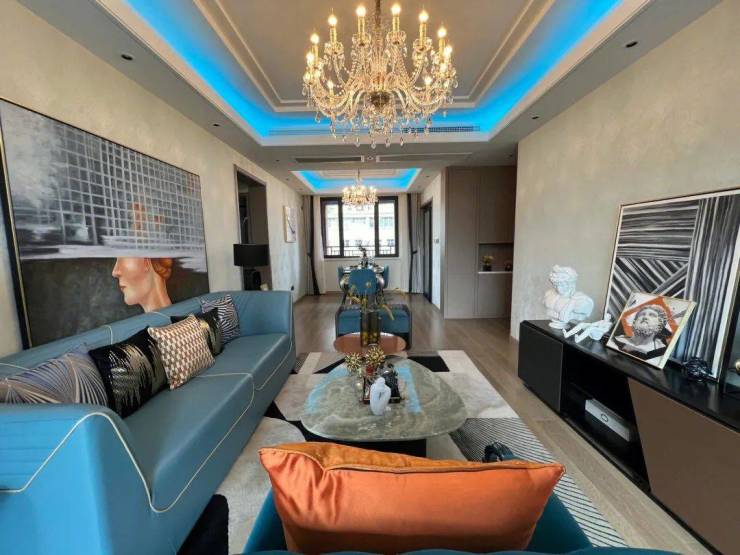 项目外立面1-3层为全进口干挂大理石,上面是深色真石漆,风格为英式古典ArtDeco,庄重典雅。
