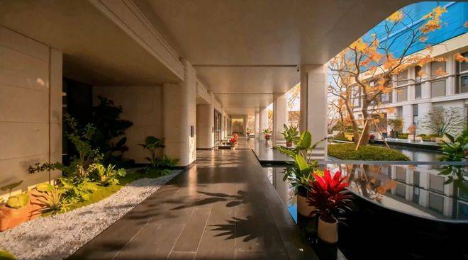 我实地逛了一圈社区,最大的感受就是“宽敞、舒适、静谧”。社区内打造约3.2万方法式美学园林,串联迎宾水景、中央草坪、慢跑步道、全龄活动区,与外部生态呼应,形成内外双园景观。社区内种植了多种名贵绿植,搭配休闲步道,平时饭后散步、休闲健身,都有合适的地方;而且项目实行人车分流设计,全地下车库,车位配比约1:1.3,充分满足高端家庭停车需求,避免了小区内车辆穿梭的安全隐患,也让社区环境更整洁静谧。