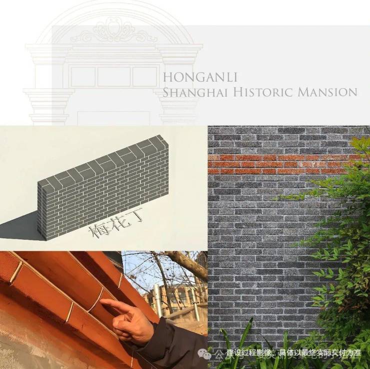 宝兴里的立面砖砌工艺,保留原筑时光浸润的老砖,通过新老结合,旧料新艺的方式,聘请新天地(一大会址)同款匠人团队,运用“梅花丁”的砌法,局部用“元宝缝”美化处理,还原经典建筑的匠心韵味,弥平时间的缝隙,于细微之处,触发人们对旧日时光的共同记忆。