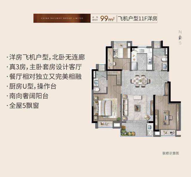 建面约99㎡洋房产品,真正的“飞机户型”,卧室分列两侧,私密性与尊崇感兼具。11F洋房的低密属性——北侧无连廊的设计,不仅进一步提升了通透性,更确保了北向卧室的私密与静谧,主卧自带独立卫浴与衣帽间,在有限面积内做出了改善级的居住体验。