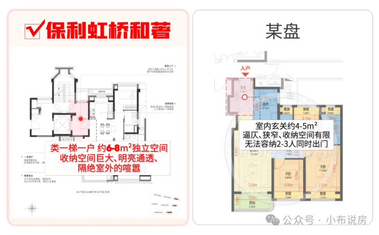 相比其他百平米3房玄关的逼仄、收纳空间少的问题,保利虹桥和著本次所有户型都做到了类一梯一户,享全明独立电梯厅:
