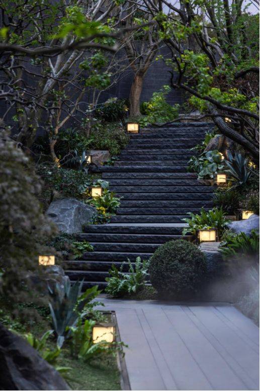 垂直峡谷庭院:近7米高差立体景观移植百年名木与叠瀑溪涧,形成“层峦叠翠”的都市山水长卷;