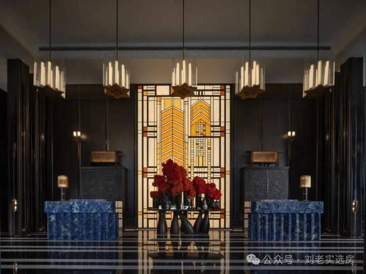 比如项目的门楼采用了上海海鸥丽晶酒店同款巴西金石材。接待大厅采用进口奢石巴西乌金石打造的大理石柱。接待台则采用玻利维亚蓝,这是世界上储存量极少的石材之一,被称为奢石中的劳斯莱斯。随处可见Old money的奢华风格。