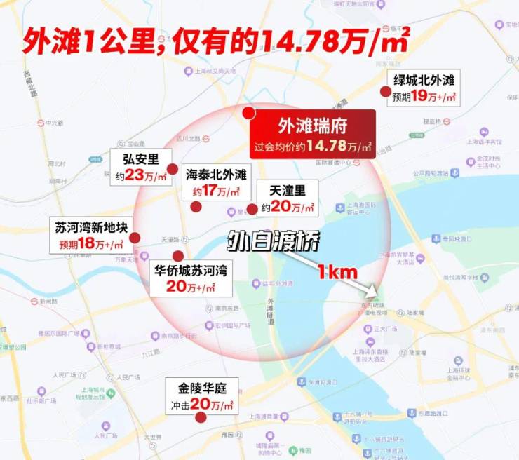 其次,在距离外滩1公里范围内,楼盘单价普遍达20万/㎡,只有外滩瑞府给出14.78万/㎡的上车机会。
