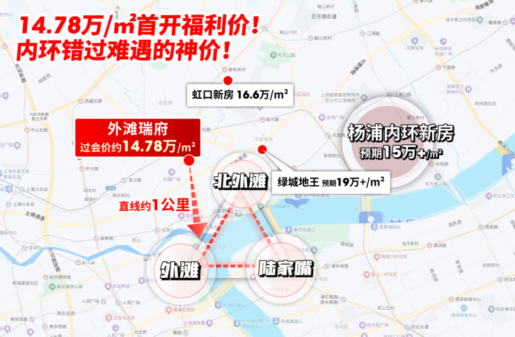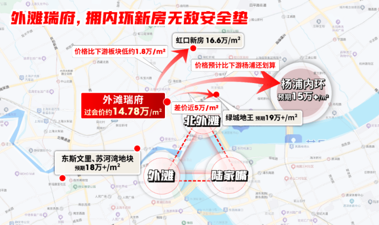 外滩瑞府离外滩更近,绿城地王位于北外滩,两者直线距离不过约1公里,但新房差价或4-5万/㎡。您认为品质差不多的情况下,未来差价有这么大?