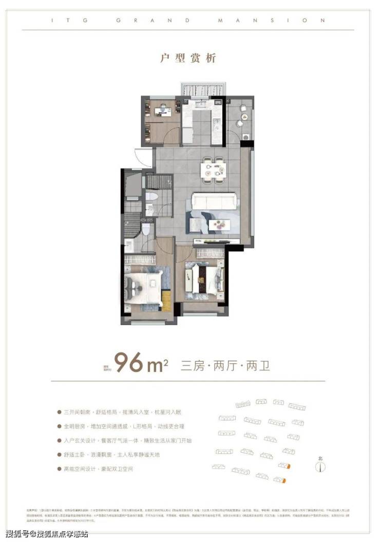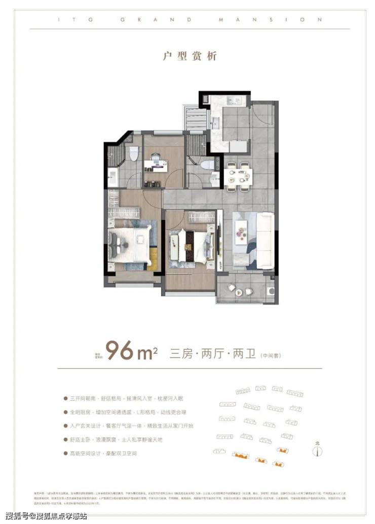户型方面:约85-96㎡的全三房设计,每一款户型都是会传递出国贸的产品观。南北通透,布局考究,动静分离。