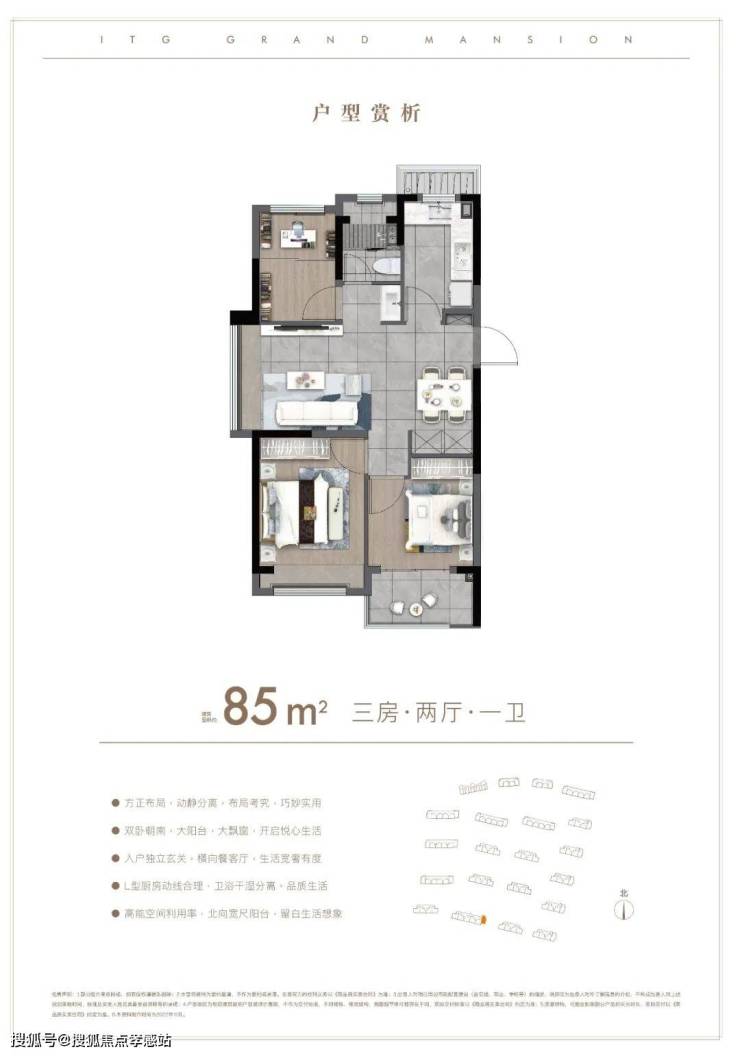 户型解析:约85㎡的3房,这种入门级的产品也要保证居住的尺度感。比如利用L形厨房与餐厅相连接,一体化的设计让空间充足利用。比如次卧连接阳台,就是人性化考虑到给他们一个私密的追光天地。