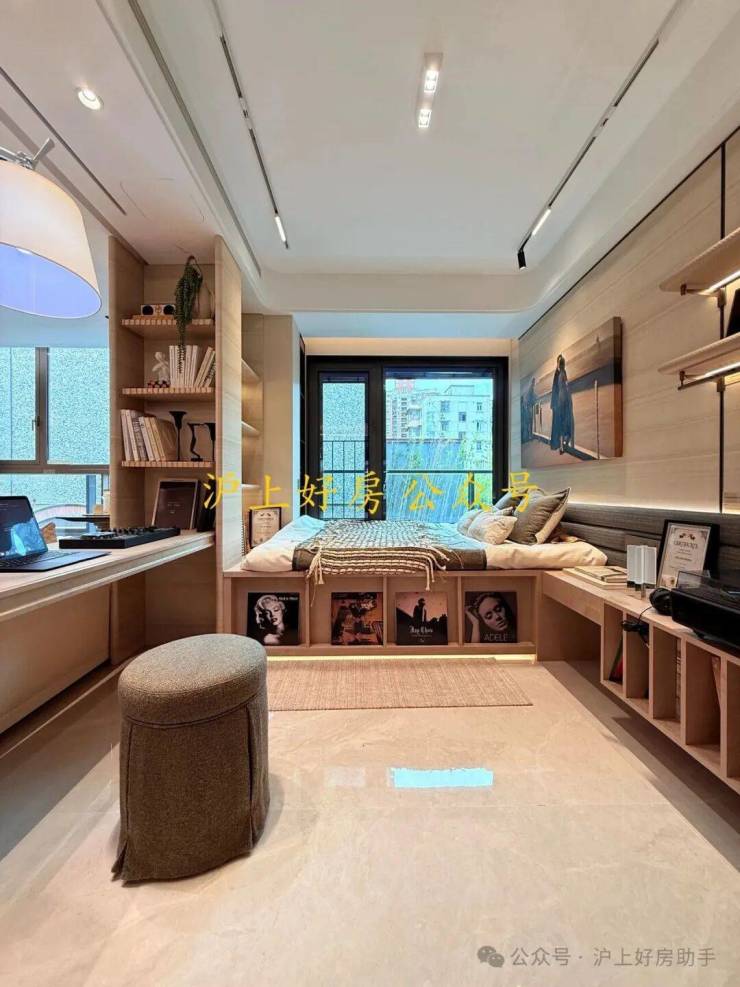 A户型连主卫都配270°转角飘窗,西侧直面杨浦内环新貌,西南侧远眺三件套,城景与生活无缝衔接。