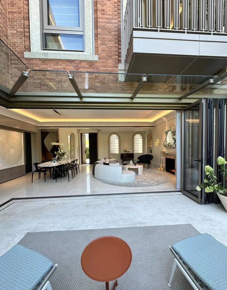「无界空间」:客厅270度转角无柱设计,搭配落地玻璃,开阔视野将院中风景迎入日常。