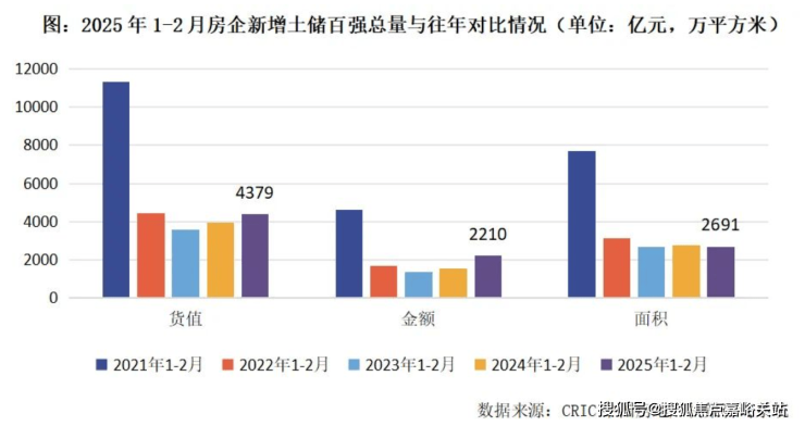 报告显示,2025年1-2月份,新增土储百强房企的新增货值、总价和建面百强之和分别为4379亿元,2210亿元和2691万平方米,货值同比增加11.3%,金额同比增长43.5%,建面同比小幅回落2.2%。