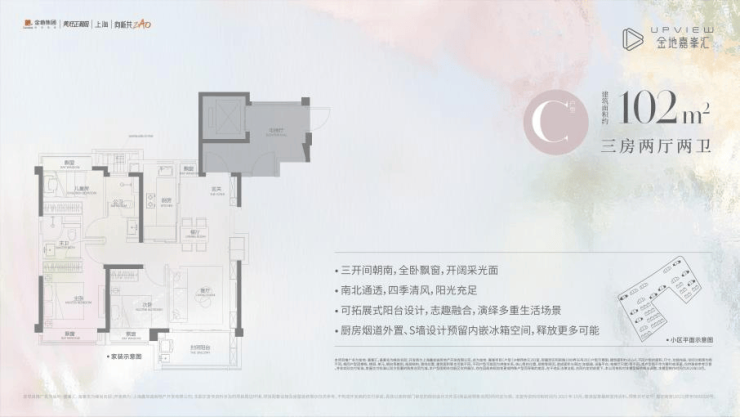 以及我们的建面约102㎡(C户型)三房两厅两卫,不仅保留了其小户型所有的优势,更增强了空间感和舒适度!