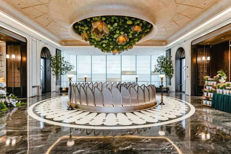 项目恢弘大气的门头,项目设计师以浮岛为灵感,将几根立柱化作悬浮的雕塑,撑起一片轻盈的仪式感。