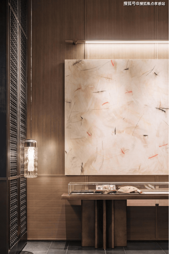 例如,在归家的动线上,保利以古代“提灯夜游”为灵感,将“灯”这一意向穿插其中——在公区入户大堂内,造型别致的壁灯格外惹眼,其灵感来自于“中国古典豆形灯”;落壁灯则是以古铜不锈钢搭配仿透光云石灯具,营造出朦胧的光晕氛围,颇具东方意蕴。