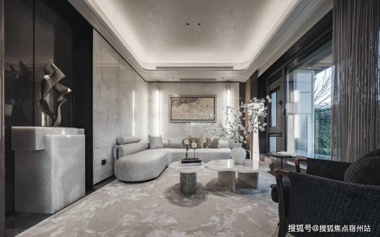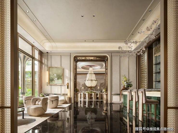 首先是奢石含量极高,从入户处的玲珑玉拼花与透光云石辉映,到翡翠绿奢石墙景、再到 发光云石装饰点亮归家路,石材的典雅贯穿始终。