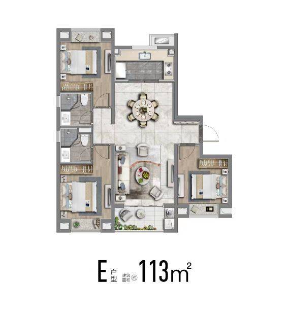也有建面约113m²舒适型三房,南北通透;飞机户型,房间分列两侧互不打扰;卧室空间也相对更大、更舒适。