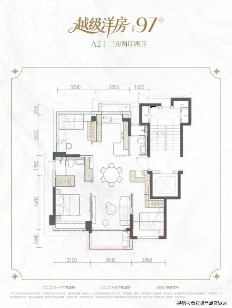 建面约97㎡三房,实得率86%-90%——相当于常规109㎡产品的使用体验。