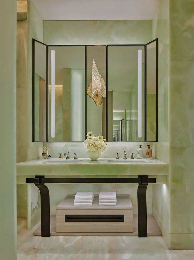 顶层下午茶区以淡绿为底,壁炉暖光漫过手绘地毯的肌理,将社交场域沉淀为冥想容器;主人房墙面缟玛瑙(Onyx)的天然流痕,也与一层屏风暗纹形成时空对位,光影在矿物晶体中生长出私密的诗。