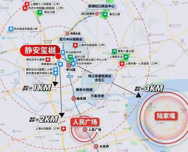 而静安玺樾到外滩和平饭店的直线距离正好是约3公里!妥妥的城心烫金地段!