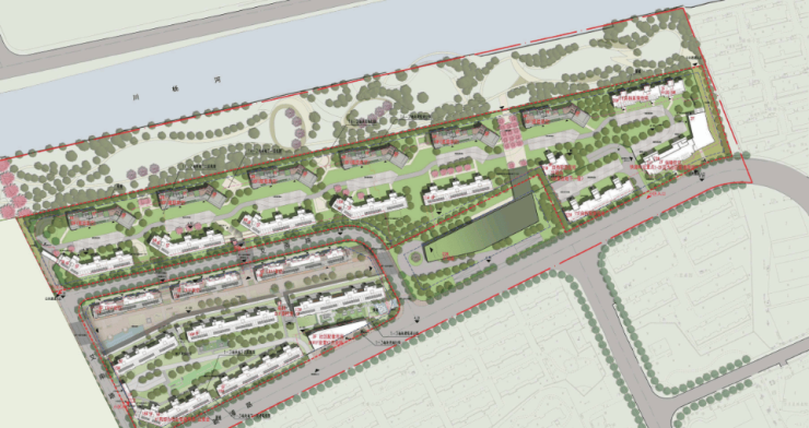 项目最大的特点就是双面临水,东侧和北侧都是天然河道,形成了不可再生的水系景观。与此同时,项目内部还自带绿地公园,占地约1.3万方。