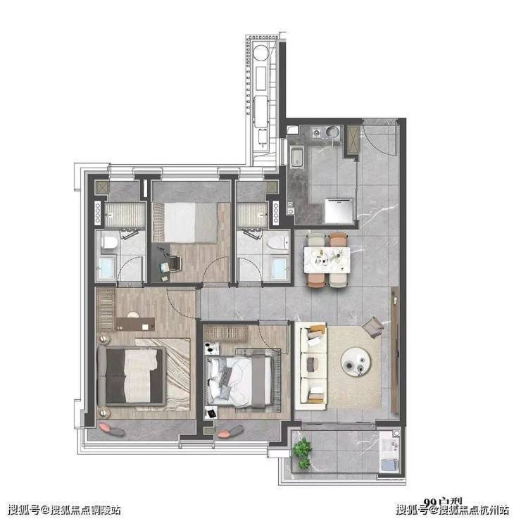 建面约99㎡的三房设计,在空间上使用功能更加多样化,一站式解决了家庭生活的所有功能,优化居家动线,大大提升空间的居住体验。