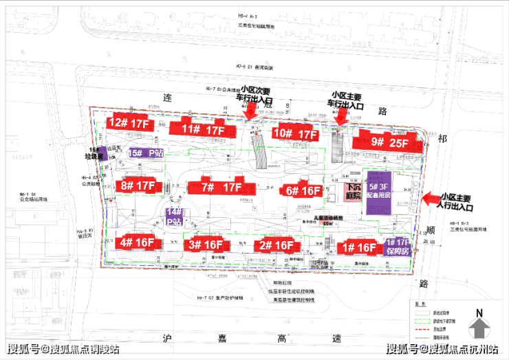 其中1号楼靠近17层的保障房,5号口为3层的配套用房;14#、15#为P站,16#为垃圾用房。