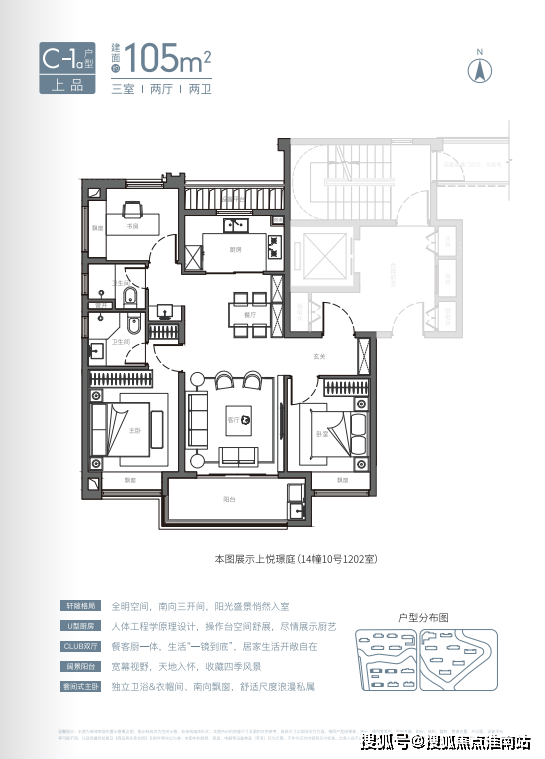 U型厨房、餐厅、客厅、阳台一线联通,南北通透。主卧套房、全卧飘窗、次卫干湿分离也都是标配。