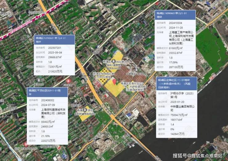 地块北侧是杨浦区N090601单元I4-01地块,出让面积16482.71㎡,容积率1.8,建筑面积29668.87㎡。地块起价213620万元,起始楼面价72001元/㎡。
