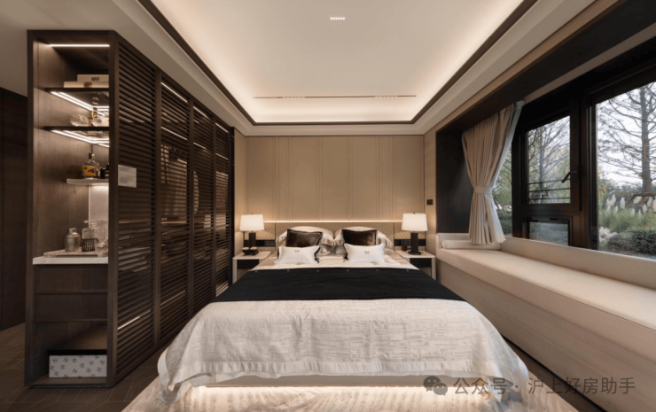 其中主卧的270°转角飘窗就有约5.7m²,通过与外立面的结合,直接做了梳妆台和储物柜,拓展了飘窗的实用性。