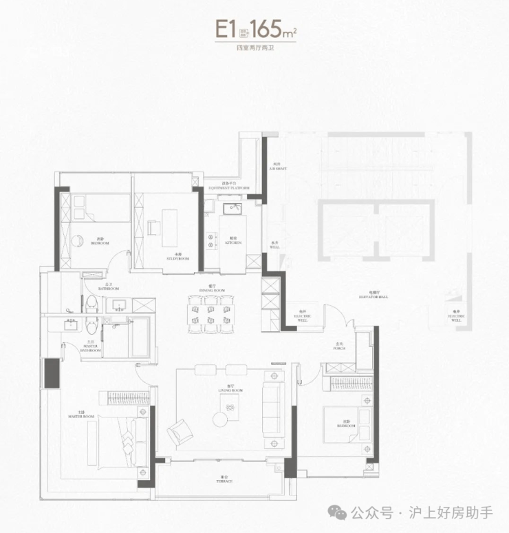 来到165㎡个户型,已经上升到上海主流的大户型改善面积段,但看设计思路,可以看出是为满足多胎家庭成长而服务的。